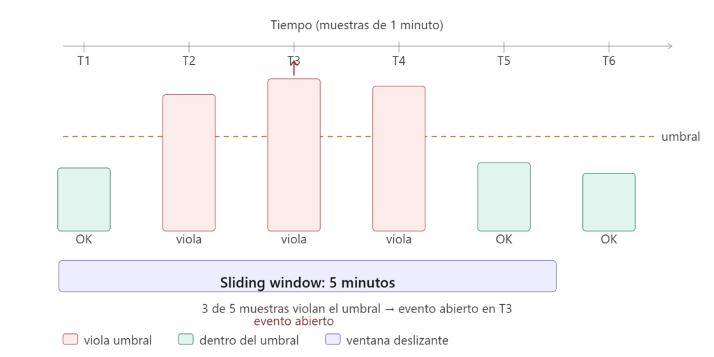 El evento permanece abierto hasta que el número de muestras que vuelven a estar dentro del umbral supera el umbral de «dealert» dentro de esa misma ventana. Un consejo práctico de la comunidad: si quieres detección rápida (por ejemplo, 3 de 5 muestras) pero no quieres que el problema se cierre y abra constantemente durante el día, necesitas un número de muestras de dealert suficientemente alto (al menos violating_samples + 1). Una configuración como 3/5 violando y 3/5 para cerrar puede producir que el problema abra y cierre varias veces seguidas si el sistema oscila alrededor del umbral.
