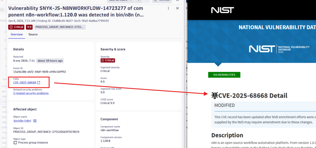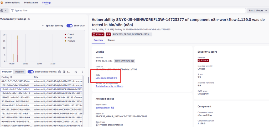 Mientras que la vista anterior mostraba problemas de seguridad agrupados (por ejemplo: «CVE-2025-68668 afecta a 5 process groups»), la nueva pestaña Findings expone cada hallazgo individual a nivel atómico, proporcionando información detallada sobre cada ocurrencia específica de una vulnerabilidad.