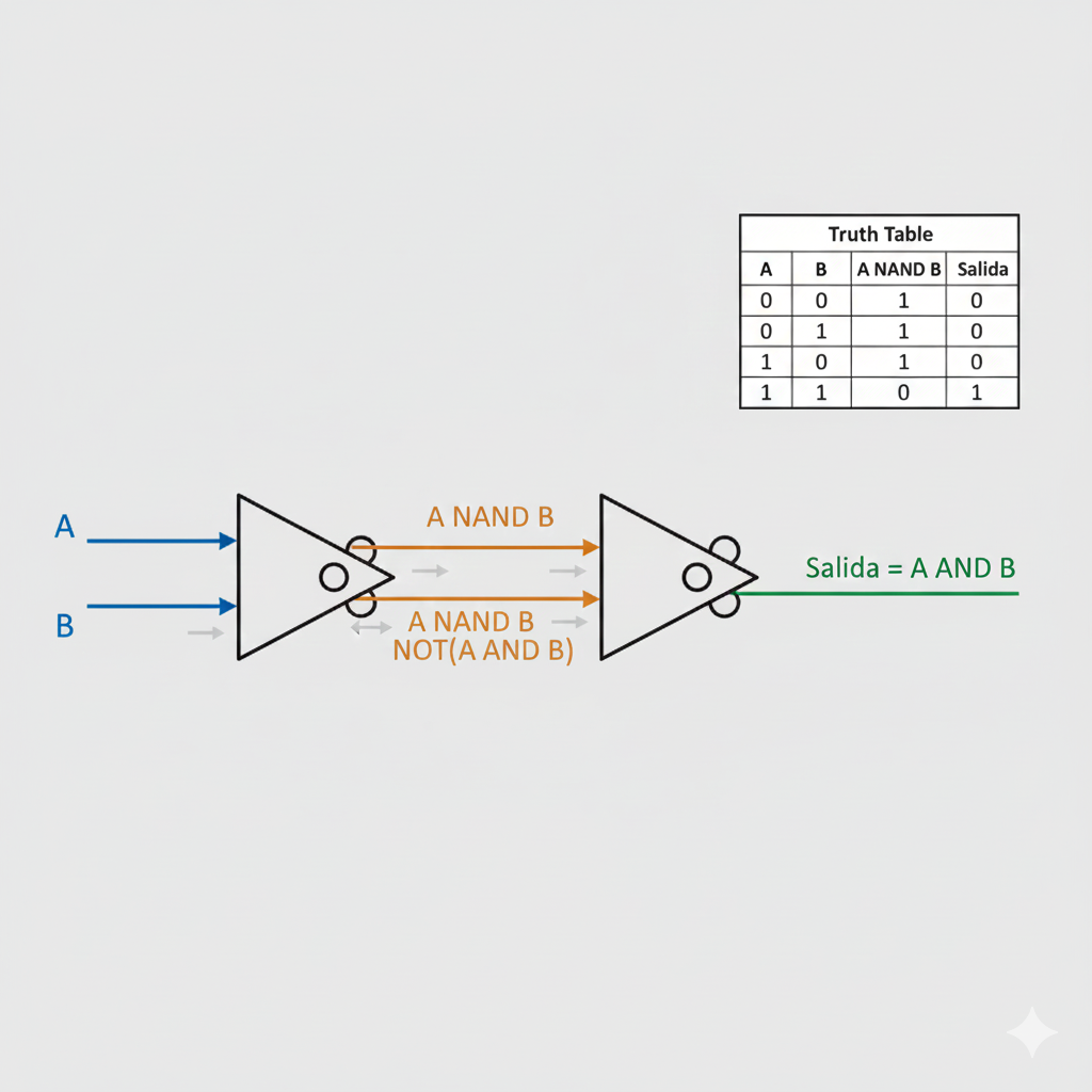 Para ilustrar la universalidad, considera cómo construir una puerta AND con puertas NAND. Una puerta NAND produce un ‘0’ solo si ambas entradas son ‘1’ (es decir, invierte el resultado de AND).