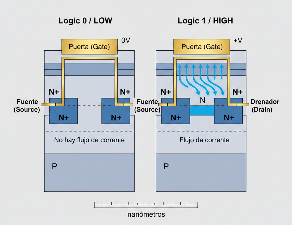 Cuando aplicas un voltaje suficiente a la puerta, el transistor se «enciende», permitiendo que la corriente fluya, representando un estado lógico ‘1’ o ‘Alto’. Si no aplicas voltaje, el transistor se «apaga», bloqueando el flujo de corriente, lo que denota un estado lógico ‘0’ o ‘Bajo’. Esta capacidad de conmutación binaria es la base de toda la computación digital. Millones de estos pequeños dispositivos, con tamaños que ya se miden en nanómetros, operan en tándem dentro de un chip.