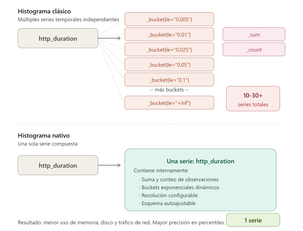 Un cambio técnico revolucionario, ilustrado en el gráfico superior, es la introducción de los Histogramas Nativos (Native Histograms). A diferencia de los histogramas tradicionales, que requerían múltiples series temporales para los diferentes niveles de datos (buckets), los histogramas nativos comprimen toda la distribución en una sola serie de alta resolución.