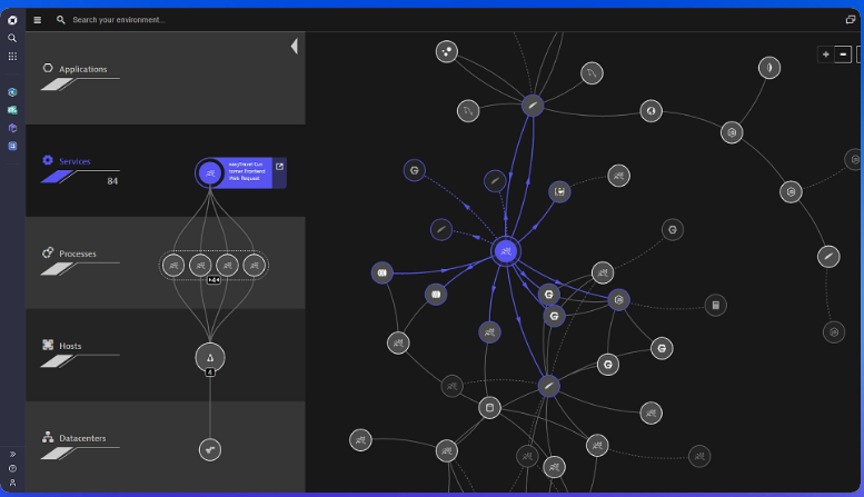 La idea es sencilla pero poderosa: en vez de mostrarte métricas aisladas de cada componente, Dynatrace construye automáticamente un mapa de dependencias vivo que refleja cómo se relacionan tus aplicaciones, servicios, procesos, hosts y centros de datos. Sin configuración manual, sin diagramas de Visio desactualizados. El propio agente descubre las relaciones observando el tráfico TCP/IP real.